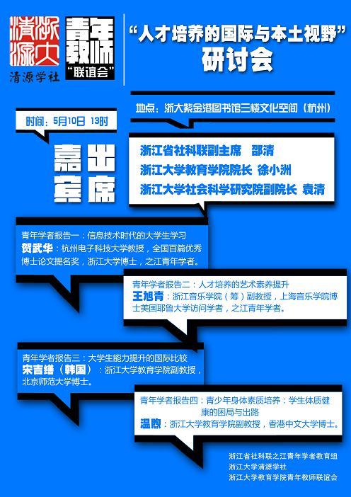 各位老师,您好! 兹定于5月10日下午13:00在紫金港图书馆三楼文化空间举行由yl8cc永利官网青年教师联谊会、浙江大学清源学社、浙江省社科联之江青年教育组联合举办的“人才培养的国际与本土视野”研讨会,敬请各位青年教师准时参加。 欢迎广大师生参加。