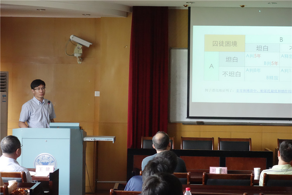 第三场讲座,由运动训练学专业国内第一位小球方向博士、体育学系刘文明副教授主讲,他以《乒乓球的博弈论》为题,从博弈论的角度对乒乓球战术系统进行构建。报告从战术及战术在体育学科中的重要性出发,介绍了战术及博弈论的概念,乒乓球中的战术研究现状,并就博弈论特别是纳什均衡在乒乓球中的应用进行了详细介绍。讲座过程中,台上台下交流互动气氛热烈。