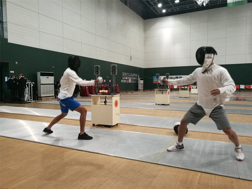 击剑培训中心负责人首先向同学们介绍了目前场馆的基本情况以及培训的相关课程。接着,击剑馆的教练员开始指导同学们学习击剑。教练员先分别介绍了花剑、佩剑、重剑三个剑种的握法和有效击中点,并向大家示范讲解了击剑的礼仪、前进后退的步伐和出手得分的动作,同时认真纠正同学们错误的动作。最后,在教练员的指导下,同学们穿戴好击剑装备,在剑道上运用刚刚学会的技术动作模拟真实比赛,一对一实战对抗。