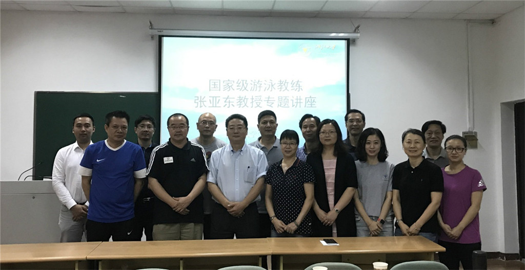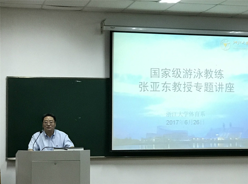 在会议的专题讲座环节,体育学系新引进的“百人计划”黄聪老师,就他在日本留学的心得与大家做了分享,介绍了自己的研究方向,并欢迎各位老师一起交流合作。最后,浙江体育职业技术学院副院长、国家级游泳教练、张亚东教授为体育学系老师做专题讲座。张院长拥有几十年的执教经验,训练理念先进,带出了罗雪娟、孙杨等一大批优秀的游泳运动员,对浙江省、乃至全国游泳运动的发展都作出了很大的贡献。张教授凭借自己几十年的执教经验,用近三小时的精彩演讲与老师们分享了自己的训练理念与训练方式。本次研讨会暨专题讲座在老师们热烈的掌声中圆满结束。