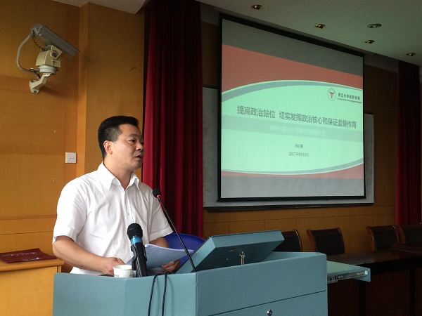 吴巨慧作题为“提高政治站位 切实发挥政治核心和保证监督作用”的发言,他指出,学院党委是学院各项事业的政治核心和保证监督,要秉承“抓好党建是尽职,不抓党建是失职,抓不好党建就是不称职”理念,做到“守土有责、守土负责、守土尽责”。2017年是个“政治年”,也是“十三五”规划的第二年,是关键一年,结合工作实际,吴巨慧强调了下半年党委工作的三个重点。第一,旗帜鲜明讲政治,加强党的领导。要加强和改进思想政治工作,培养有理想、有境界、有精神、有责任的青年学子,建设“信念坚定、师德高尚、业务精良”的师资队伍。要强化意识形态工作,牢牢掌握意识形态工作的领导权和话语权,并充分发挥党委政治核心和监督保障作用。第二,强基固本重实效,务实推进党的建设。要推进“两学一做”学习教育常态化制度化,不断优化党支部设置,严格落实基层党建制度,加强党员骨干队伍建设,规范党员组织管理,培养党员干部,提高党员素质。第三,履职尽责树正气,纵深推进全面从严治党。要强化主体责任意识,强化纪委监督责任,党委自觉担负党风廉政建设政治责任,压紧压实各级单位主体责任,建设忠诚党的教育事业的教师队伍。