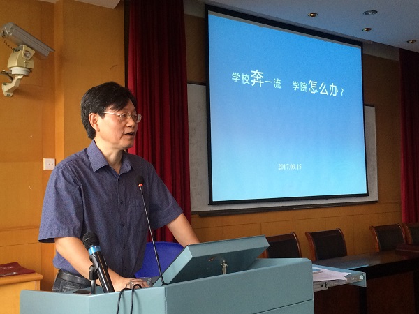 院长顾建民作了题为“学校奔一流,学院怎么办”的报告,提出当前学校正处于加快推进世界一流大学和一流学科建设的重要时期,发展势头强劲,学院应当抓住时机,努力寻求自身改革与发展。他传达了学校暑期工作会议精神,从学校“三步走”的冲刺目标、“双一流”建设的战略目标,底蕴、品质、特色、声誉优先的内涵发展道路,“中国特色、世界一流”的定位,“综合性、研究型、创新型”办学定位等方面阐述了学校的发展目标和战略定位。顾建民指出,在学校奔向一流、勇攀高峰的征程中,学院不能置身度外、超然物外,必须把握机遇、主动选择、乘势而上。一要增强主流意识,紧紧围绕学校“双一流”建设战略目标,将“一流意识”内化于心,外化于行,融入日常,贯穿始终。二要明确主流方向,结合学院“十三五”规划,保持和增强传统学科优势,鼓励和加快交叉学科特色发展,促进和提升新兴学科主导地位,稳固和推动特色学科建设。三要打造精兵强将,实施“人才强院”行动计划,按照学科发展要求大力培养和引进60后学术领军人才、70后学术骨干人才及80后学术拔尖人才。四要力求提质增效,人才培养要守底提质,科学研究要保量提质,社会服务要提质增效,国际交流要继续领跑。