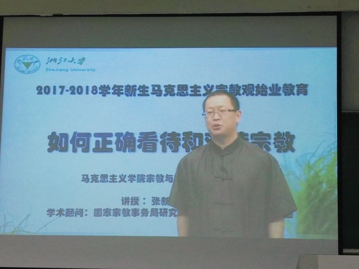 第二场讲座是马克思主义学院的张毅老师带来的视频教学——“2017-2018学年新生马克思主义宗教观始业教育”。主要包括四个方面:一是为什么要关心宗教问题。张老师从宗教的长期性和群众性、宗教的特殊复杂性两个方面结合案例加以说明。二是如何看待宗教。张老师介绍了无神论,分析了宗教作用的二重性原理。三是如何对待宗教。张老师着重提出,我们应坚持党和政府提出的处理宗教问题的基本方针。四是在校期间应对宗教问题的几条建议,包括遵守纪律、加强团结和坚决抵制邪教。