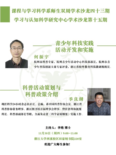 课程与学习科学系师生双周学术沙龙四十三期、学习与认知科学研究中心学术沙龙第十五期