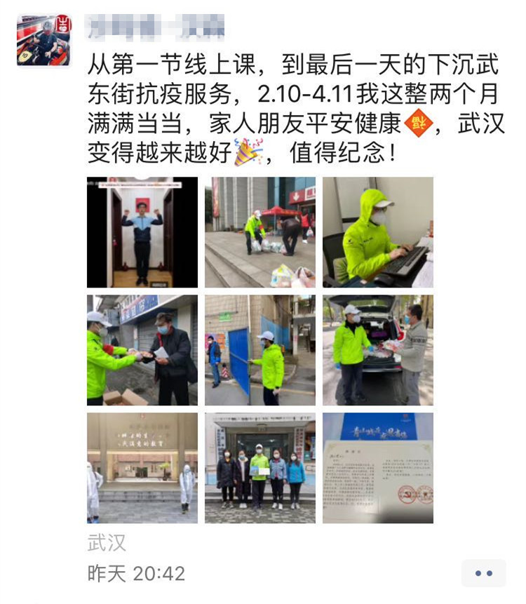 “从第一节线上课,到最后一天的下沉武东街抗疫服务,2.10-4.11我这两个月满满当当,家人朋友平安健康,武汉变得越来越好,值得纪念!”