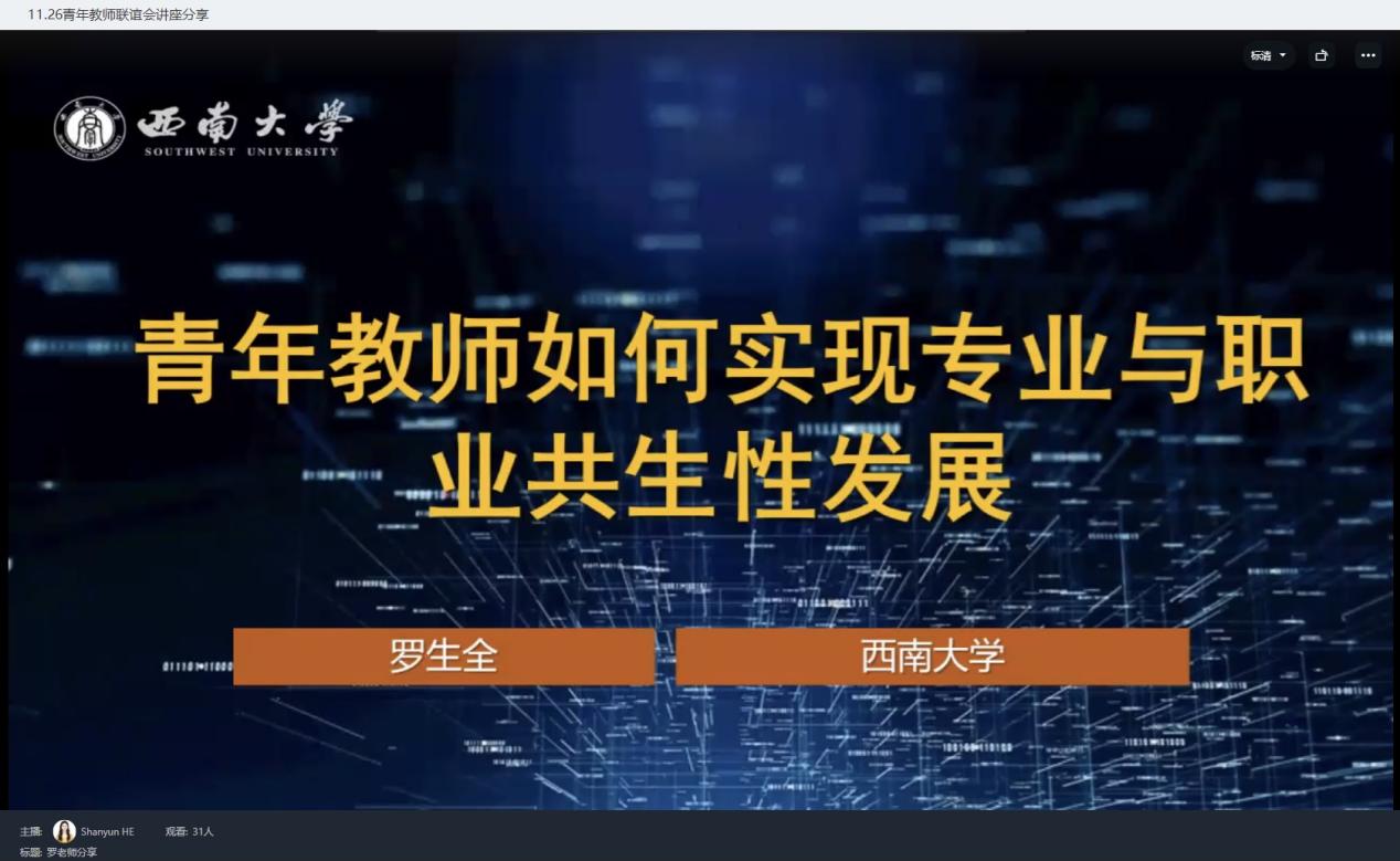11月26日下午,教育学院青年教师联谊会“青椒汇”系列活动暨yl8cc永利官网求是导师学校系列活动在线上举办。活动邀请西南大学教育学部副部长罗生全教授作题为“青年教师如何实现专业与职业共生性发展”分享,共有50多名师生线上参与。本次活动由yl8cc永利官网青年教师联谊会会长何珊云副教授主持。