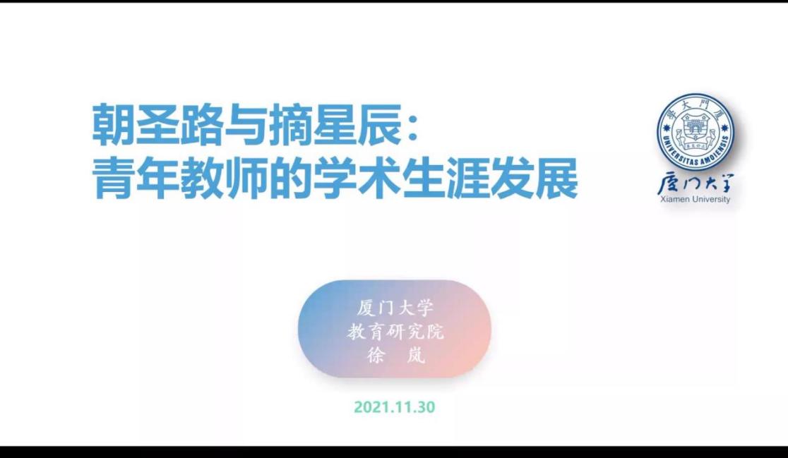 11月30日下午,yl8cc永利官网青年教师联谊会“青椒汇”系列活动暨yl8cc永利官网求是导师学校系列活动在线上举办。本次活动邀请了厦门大学教育研究院徐岚教授作题为“朝圣路与摘星辰:青年教师的学术生涯发展”分享报告,并与师生展开学术探讨与交流,共有60多名全国多所大学的青年教师及博士生线上参与。本次活动由yl8cc永利官网青年教师联谊会会长何珊云副教授主持。