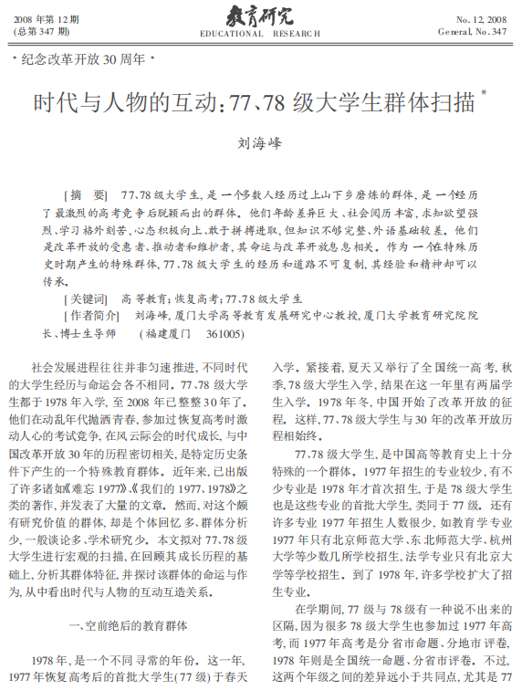 77、78级大学生都于1978年入学,1982年毕业。他们在动乱年代抛洒青春,参加过恢复高考时激动人心的考试竞争,在风云际会的时代成长,与中国改革开放的历程密切相关。刘海峰教授该文高屋建瓴地对这个特殊教育群体进行宏观扫描,在回顾其成长历程的基础上,分析其群体特征,并探讨了该群体的命运与作为,让人们清晰地看到时代与人物的互动互造关系。该文史论结合、大气磅礴、文笔优美,所以一经推出,便不胫而走,引起知识界的强烈反响。