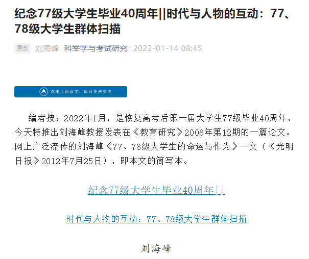 为纪念恢复高考后第一批大学生77级毕业40周年,2022年1月14日,“科举学与考试研究”微信公众号推送了刘海峰教授发表在《教育研究》2008年第12期的《时代与人物的互动:77、78级大学生群体扫描》这一当代教育史论文。该文推送后受到高度关注,第3天阅读量即达10