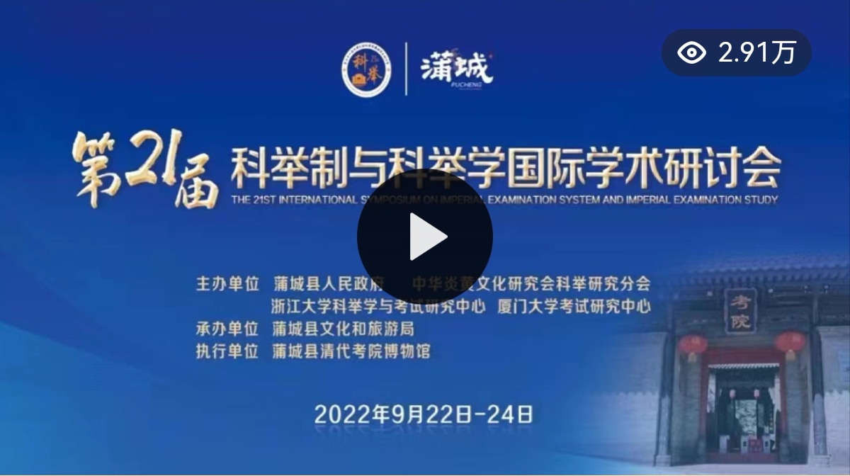 9月23日-24日,由蒲城县人民政府、中华炎黄文化研究会科举研究分会、浙江大学科举学与考试研究中心、厦门大学考试研究中心主办,蒲城县文化和旅游局承办的“第二十一届科举制与科举学国际学术研讨会”在陕西蒲城县顺利召开。来自美国纽约市立大学、美国马萨诸塞大学、日本东北大学、韩国成均馆大学、中国社会科学院、浙江大学、复旦大学、武汉大学、北京师范大学、厦门大学、陕西师范大学等70余所海内外高校和南京中国科举博物馆等科举类博物馆的174位专家学者在有“龙脉福地、将相故里”美誉的陕西蒲城通过“线上+线下”相结合的方式参加本届国际学术研讨会,并通过直播形式向国内外公开,观看人数达到2.91万人次,获点赞6千余。