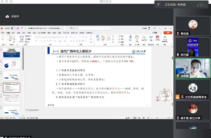 在分论坛上,yl8cc永利官网“百人计划”研究员李木洲以“宋代科举考官锁院活动探析——以锁院诗为中心的考察”为题作了线上论文报告。博士后朱沛沛以“中国科举研究三十年历史回顾”为题、博士生苑津山以“三十年来科举学的形成与发展”为题、博士生袁浪华以“察举制向科举制流变的动力分析”为题、博士生钟伟春以“科举制度下家道结构变迁与家庭成员角色”为题、博士生曾思鑫以“明清乡试录取率综考”为题、博士生赵凯以“科举交往史:由关系视角下移的科举史”为题、博士生傅冠华以“晚清顺天与山西乡试借闱的比较研究”为题、硕士生孙艺源以“基于科举与高考的比较反思我国区域公平问题”为题,分别按主题分类在现场作了论文报告;博士生韦骅峰以“清代以前广西科举考论”为题在线上作了报告。