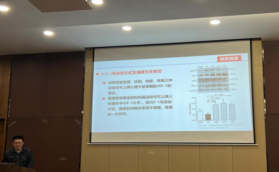 李博文以《运动激活IGF-1/IGF-1R/PI3K/AKT通路改善心梗诱导的小鼠骨 骼肌减少》为主题做了报告。该研究表明,心梗导致骨骼肌减少,而抗阻和有氧运动通过刺激心梗小鼠骨骼肌内源性IGF-1表达激活骨骼肌IGF-1/PI3K/AKT通路,降低骨骼肌氧化应激水平,抑制骨骼肌细胞蛋白质泛素化降解和凋亡,提高肌生成因子水平,提高骨骼肌质量,抑制心梗诱导的骨骼肌减少。