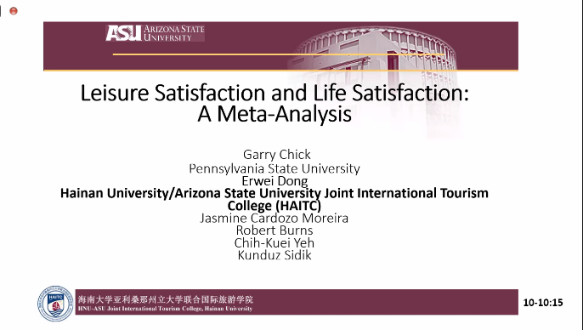 会议共包含4个议题。议题一——Sport, Leisure and Subjective Well-being(运动休闲与幸福生活)由杭州师范大学凌平教授主持。香港浸会大学Atara Sivan教授、宾夕法尼亚州立大学John Dattilo教授以及亚利桑那州立大学Erwei Dong教授分别发表主题演讲。Atara Sivan教授的演讲聚焦于休闲教育如何促进福祉,尤其关注学生群体的休闲教育。通过分享一项关于休闲与福祉的研究成果,Atara Sivan着重介绍了休闲教育的愿景与目标,以及校园休闲教育的战略与方法。Atara Sivan教授强调,休闲教育对人的发展具有重要意义,并且学校在休闲教育中发挥着重要作用。John Dattilo教授同样关注休闲教育。他的演讲着重介绍“何为休闲教育”以及“休闲教育的目标”。值得一提的是,John Dattilo教授关于休闲教育的思考深受中国道家文化的影响。他在借鉴道家文化的基础上,提出休闲教育服务递送模型(A Leisure Education Service Delivery Model),为休闲教育理论提供中西合璧的创新思路。Erwei Dong教授介绍了一项关于休闲满意度与生活满意度的元分析研究。通过分析19项来自于中国台湾省、中国新疆维吾尔自治区乌鲁木齐市以及巴西蓬塔格罗萨等地区关于休闲满意度与生活满意度的调查数据,Erwei Dong教授研究认为,休闲满意度与生活满意度之间存在相互影响的关系,两者的相关性在跨文化方面可能不存在实质性差异。