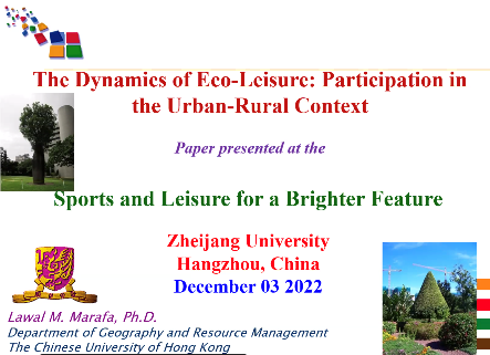下午,会议进入后两个议题。会议议题三为——Sports, Leisure and Economic Development(运动休闲与经济发展),本环节由浙江大学百人计划研究员于洁博士主持。广州体育学院的周良君教授、清华大学的冯晓露博士后、香港中文大学的Lawal Mohammed Marafa教授和澳大利亚维多利亚大学的John Tower教授发表了演讲。周良君教授分享的主题是粤港澳大湾区跨境体育消费的决定性因素。他的研究分析了广东、香港、澳门等地居民参与跨境体育消费的特点。在此基础上分析提出,影响粤港澳大湾区内个人跨境体育消费的主要动力包括价格和产品质量、 预售服务、体育场地设施和选择的多样性。冯晓露博士的研究关注城市工业用地再利用于体育产业的问题。通过北京首钢园、二汽工厂、博锐体育综合体等3个案例介绍了北京将工业用地转化为体育场地的经验,他深入分析了城市工业用地再利用过程中存在的问题与改进思路。John Tower教授分享的主题聚焦于休闲体验效益与休闲管理。他介绍了休闲项目、休闲设施与休闲服务的概念和发展目标、测量休闲体验效益的方法以及测量休闲体验效益的重要意义。他强调,切实理解体育休闲效益有助于项目实施者和政策制定者更有效的发展休闲项目。Lawal Mohammed Marafa教授的研究关注城乡生态休闲发展。他首先介绍了生态休闲的发展背景、生态休闲的概念与组成要素。接着,通过丰富的图片与全球案例,他充分展示了城市和农村中生态休闲的发展现状,并论述了生态休闲空间对人的发展的重要性。最后结合研究成果,他为城市和农村生态休闲的未来发展提出对策建议。