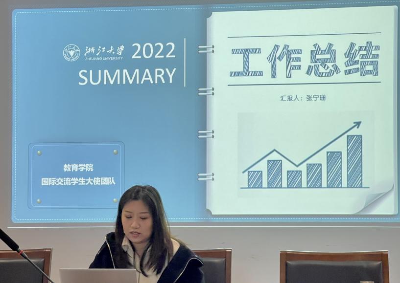 2020级比较教育学专业博士生张宁珊同学代表大使团队做2022年度工作汇报。汇报主要围绕团队介绍、团队运营制度及年度工作内容等方面展开,重点介绍了过去一年里大使团队在对外宣传、项目管理与资讯搜集等方面的工作成果,为学院全方位开展国际交流合作提供了重要支撑。