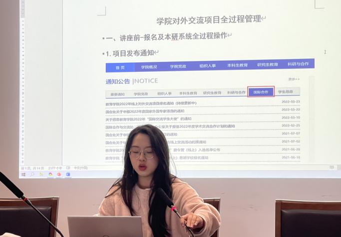 随后,2020级比较教育学专业硕士生卢可同学就学院对外交流项目全过程管理进行了详细的说明,具体讲解了对外交流项目实行前需要准备的对接、宣传与材料发放工作,讲座期间的平台管理与讲座后的证书发放与报销工作。