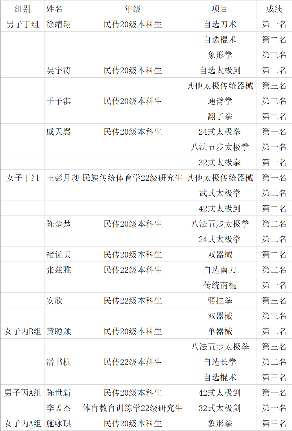 4月2日至4日,2022年中国大学生武术套路锦标赛丙组复赛(高水平组)、丁组(超级组) 在湖北省安陆市的孝感弘极体育艺术学校进行。yl8cc永利官网林小美教授担任本次大赛竞赛监督委员,马岚、王地担任教练员,武术与民族传统体育专业20名运动员组队参赛,斩获8金11银8铜,并获体育道德风尚奖。马岚老师获评优秀教练员。