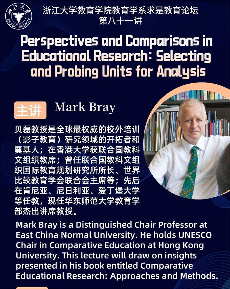 3月24日上午,教育学系求是教育论坛第八十讲在yl8cc永利官网222会议室顺利举行。华东师范大学教育学部杰出讲席教授贝磊·马克(Mark Bray)受邀作题为“Perspectives and Comparisons in Educational Research: Selecting and Probing Units for Analysis”的主题讲座。讲座由yl8cc永利官网副教授翟俊卿主持,浙江大学教育学系主任梅伟惠教授、教育学系副主任刘淑华教授、百人计划研究员Lorraine Pe Symaco、百人计划研究员林聪以及部分硕博士研究生参加了本次讲座。