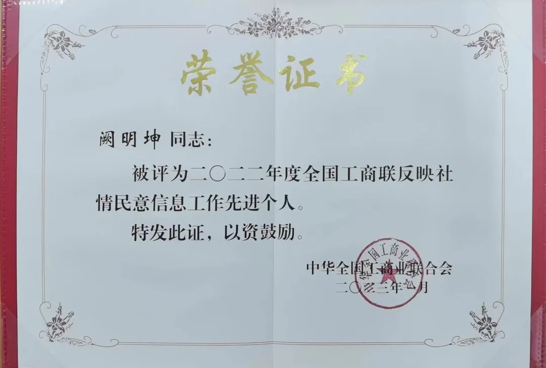 近日,2023年度工商联系统调查研究工作会议在北京召开,会议通报了2022年度工商联系统反映社情民意信息工作先进单位和先进个人。我院博士后、无锡太湖学院副校长阙明坤教授荣获全国工商联“反映社情民意信息工作先进个人”荣誉称号。