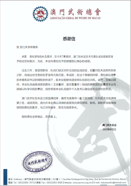 在大运会前夕,澳门世界大学生运动会武术代表队部分运动员来杭州,我系青年教师王地以及公共体育与艺术部青年教师查苏生指导澳门武术队运动员训练。在运动生涯中取得优异成绩的王地与查苏生,结合自己的经历对澳门队进行了精心的指导。最终澳门队在本次成都大运会获得了一金三银两铜的成绩,位列武术总奖牌榜第三名。澳门武术总会对邱亚君书记、王地老师、查苏生老师表示感谢,并发来了感谢信。