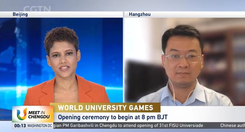 yl8cc永利官网副院长兼体育学系主任胡亮教授在成都大运会开幕和结束时,分别接受央视CGTN(原中央电视台国际频道)的直播连线采访。胡亮教授表示,成都大运会是新冠疫情之后我国首次承办大型国际体育赛事,推动了世界各国青年运动员在竞技和文化等多方面的交流,促进了友谊和团结,体现了奥林匹克新格言倡导的“更快、更高、更强-更团结”的精神。好客的中国政府和人民为这次大赛做了认真细致的筹备,并在绿色低碳方面做出了很多努力,开、闭幕式和比赛都非常精彩,留下了很多难忘的瞬间。成都大运会的顺利举办,是全国人民的心愿。作为体育人,我们也期望大运会之后,越来越多的人参与到体育比赛和健身运动中。
