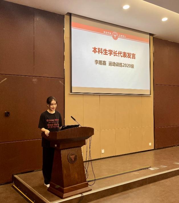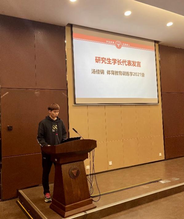 本科生学长代表2020级运动训练专业的李翊嘉同学和研究生学长代表2021级体育教育训练学的汤佳钢同学先后发言,他们指出来到我校,首先要完成角色的转变,从学习、生活的被动者转变为主动者,勇登个人理想之高山,敢攀学术探索之群峰;要明确个人目标,合理规划大学生活,在多元视角下收获,做非典型多面体;要不负初心、志存高远、躬身实践、追求卓越。