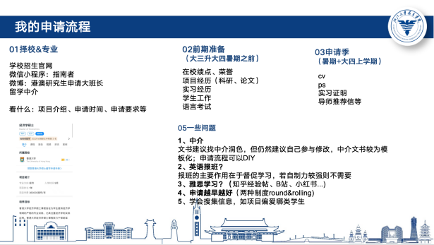 紧接着,周佳雯学姐从确定留学目的地、学校和专业、如何进行语言准备等方面向同学们介绍了硕士申请的流程及注意事项。周学姐特别提醒同学们,在推荐信的准备环节要多和任课老师沟通,不要害怕被老师拒绝。在周学姐对港大课程内容设置和个人就读体验的分享中,同学们也了解到港大对课程作业要求较高,需要具备良好的英语听说读写的能力;而留学深造,也有助于提高同学们自身的跨文化沟通能力和适应能力。