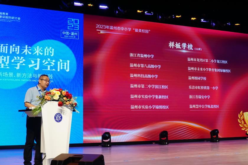 会议开幕式由yl8cc永利官网党委委员、教育领导与政策研究所常务副所长邵兴江老师主持。浙江省教育发展中心党总支书记、主任汪国辉为大会致辞,他充分肯定了温州近年来在学习空间建设方面所作的努力与取得的成果,指出当前全省美丽学校建设面临的重要课题和任务是如何将先进的教育理念、学校的文化传承融入到学校规划设计中,实现理念、课程、文化与空间的深度融合。温州市教育局党委书记、局长郑焕东为大会致辞并作主旨报告,分享了温州在教育基建方面的三大创新举措,坚持“规划、建设、立法”三位一体确立学校建设规范,坚持“最美、品质、智慧”三位一体创设更优学习空间,坚持“党建、质控、联动”三位一体保障学校建设品质。