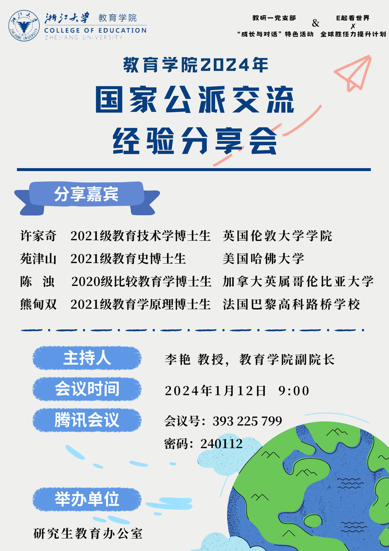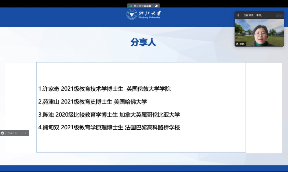 本次会议全程采取线上形式进行,由学院分管研究生教育工作和国际化工作的副院长李艳老师主持并作申报动员,4位在2023年度获得国家公派资助的博士研究生应邀做经验分享,学院研究生教育办公室王伊滢老师以及70余名硕博研究生参加会议。会议为yl8cc永利官网“E起看世界·全球胜任力提升计划”、教育学科研究生第一党支部“成长与对话”系列活动之一。