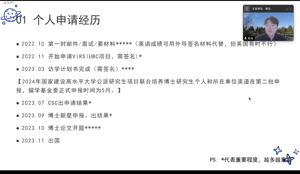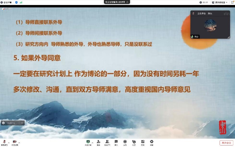 逆势而上”。陈浊同学也提到了国外访学博士生以“非正式访客身份”融入国际学术共同体的困境,分享了海外学习生活的思考,提醒同学们需要考虑清楚联培的真实意义。最后,熊甸双同学分享了特别的改派经历,如果因为客观原因无法按计划出访,最晚可以在派出时间一个月前申请改派。