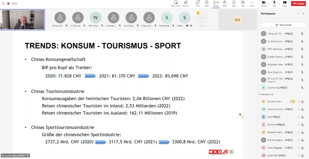 此次研讨会旨在进一步加强奥地利与中国在户外运动领域的交流和合作,共同推动户外运动的可持续发展。周丽君教授作为户外运动产业领域的知名专家,以China’s Outdoor Sports Industry:Current Situation Analysis & Future Development Trends为题,对中国户外运动产业的发展现状、相关政策以及发展前景进行了深入的分析和展望。