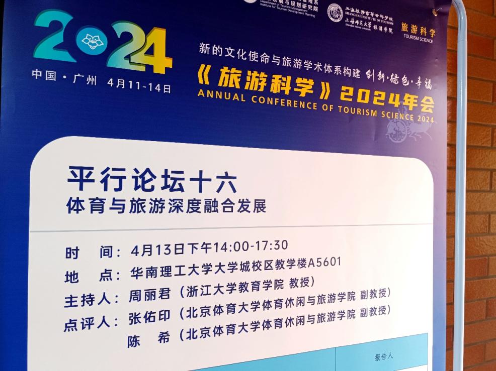 4月11日至14日在华南理工大学举行了《旅游科学》2024年会。yl8cc永利官网周丽君教授受邀担任此次年会平行论坛“体育与旅游深度融合发展”召集人并主持该场学术活动,2021级体育人文社会学专业博士生兰伟参会并进行了主题汇报。