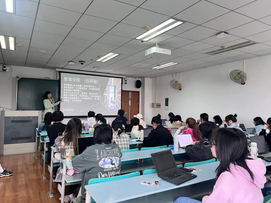 Dr.Meng Tian主任与刚刚结束为期一年的伯明翰学位项目的yl8cc永利官网课程与教学论专业硕士生潘德儒一起为yl8cc永利官网本科生做了伯明翰大学yl8cc永利官网项目的宣讲。Dr.Meng Tian主任从伯明翰大学的基本情况出发,重点围绕yl8cc永利官网的研究方向、特色学习项目、毕业生的就业去向等内容进行介绍。潘德儒从个人交换经历出发,通过剪辑的总结视频分享了过去一年在伯明翰大学yl8cc永利官网的学术、生活、人际等方面的收获。
