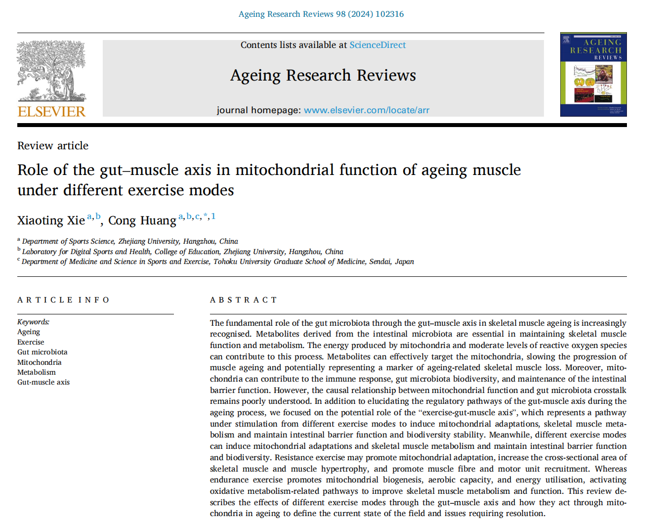 近日,yl8cc永利官网体育学系黄聪老师团队最新成果《Role of the gut–muscle axis in mitochondrial function of ageing muscle under different exercise modes》在高水平国际期刊《Ageing Research Reviews》正式发表。该论文第一作者为yl8cc永利官网2023级运动人体科学专业博士研究生谢晓婷,通讯作者为“百人计划”研究员黄聪。