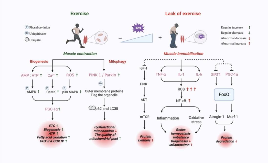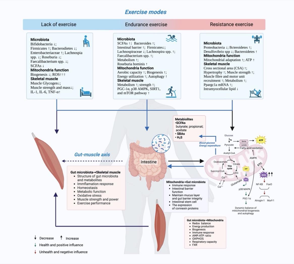 除了阐明衰老过程中肠道-肌肉轴的调控途径外,本文重点研究了“运动-肠道-肌肉”轴的潜在作用,其代表了不同运动模式刺激下诱导的线粒体适应、骨骼肌代谢和维持肠屏障功能及生物多样性稳定的途径。不同类型的运动会引起线粒体的特定适应性反应,并可通过肠道菌群或其他对维持体内平衡和延缓骨骼肌衰老过程中至关重要的系统来调节宿主功能。然而,目前对不同运动模式下线粒体与肠道-肌肉轴之间存在的相互影响了解有限,但通过线粒体生物生成和自噬之间的动态平衡可知,定期运动是改善宿主功能异常、积极影响肠道微菌群生物多样性和骨骼肌功能的有效策略。这可能解释了不同运动模式的潜在益处,并可作为肌肉减少症患者的治疗目标。本文首次提出“运动-肠-肌”轴理念并揭示其对衰老肌肉线粒体功能的作用及分子生物学机制。