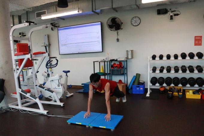 在体能测试环节。所有同学被均分为三大组,两两配合,一人为测试者,一人为记录者,三大组分别进行腘绳肌北欧式卷曲(Nordic Hamstring Curls)、反向纵跳(Counter-Movement Jump)、深蹲预测1RM(Back Squat Predicted 1RM)三大体能测试项目。腘绳肌北欧式卷曲主要使用NordBord设备测量腘绳肌离心的力量大小;CMJ主要使用测力台测量离地高度以及Absolute Maximal Force来评估测试者的下肢爆发力;深蹲1RM的预测主要采用基于速度训练方法(VBT,Velocity-Based Training),通过测量运动员完成深蹲动作的最快速度,并结合所承受的负重,来对测试者的最大深蹲重量(1RM)进行估算。之后同学们又统一进行了俯卧撑推力试验(Ballistic Push-up Test)即从俯卧撑的姿势迅速屈伸肘关节将身体推入空中,利用Kistler Force Plates(测力板)测量功率、力、高度等各项数据来评估测试者上肢力量。随后,Daniel Hackett博士从数据可靠性、变异系数、测试管理等多方面解释运动测试结果,并针对力量训练最佳时间、训练时饮食习惯以及研究对象评估困难如何解决等不同方面的问题进行讨论,现场互动氛围非常热烈。