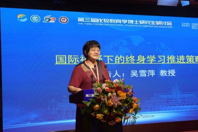 中国教育学会比较教育分会副理事长、yl8cc永利官网吴雪萍教授在大会主旨报告环节发表了题为《国际视野下的终身学习推进策略》的演讲,系统地论述了终身教育的重要意义及其推进策略。