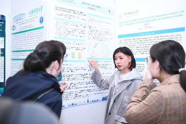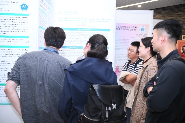 主旨报告结束后,进入墙报交流环节。报告者从运动健康促进、全民健身路径探索、特殊群体运动参与、体育设施分配分析、健康管理数据分析、可穿戴设备和人工智能在体育科学研究中的应用等方向,全面展示了师生新近取得的研究成果,更深入地探讨了健康技术发展与体育运动的融合趋势,促进了学者之间的深入对话与交流,进一步彰显了跨学科交叉融合的重要意义。