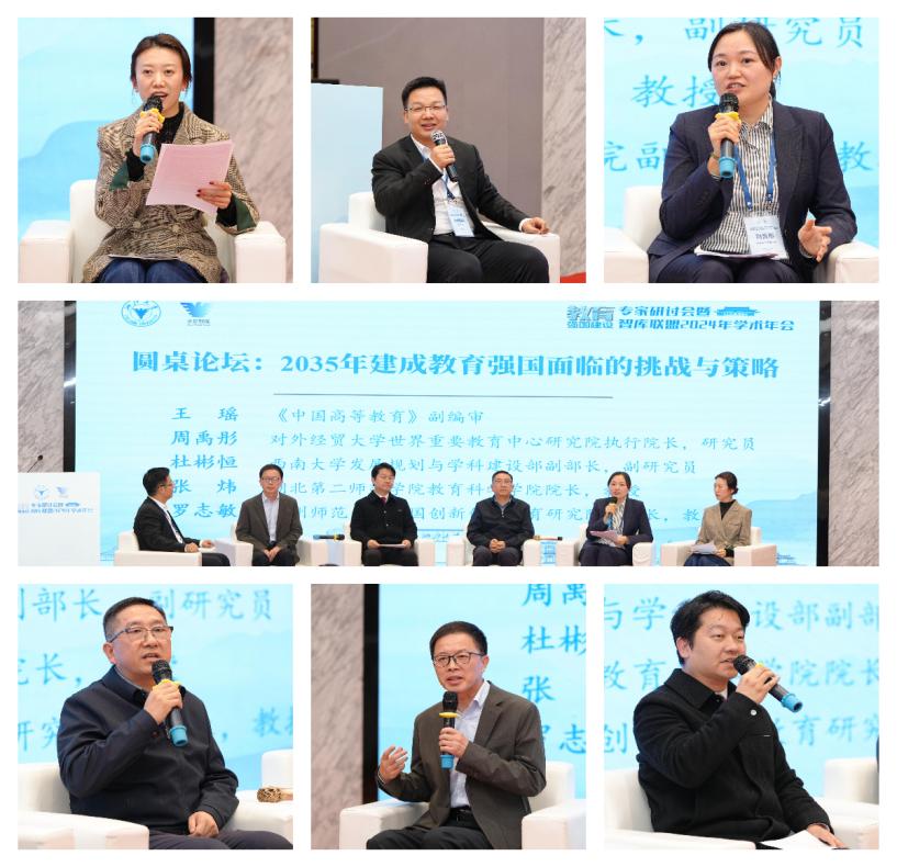 在以“2035年建成教育强国面临的挑战与策略”为议题的圆桌论坛环节,《中国高等教育》副编审王瑶指出,建设教育强国是一项复杂工程,面临着极高的标准、复杂的内外环境与紧迫的时限三重挑战。期刊与高校应当通过搭建平台、集思广益,共同推进教育强国建设。对外经济贸易大学世界重要教育中心研究院执行院长周禹彤研究员围绕“教育强国的定义、目标、怎么建”三个问题阐述了建设教育强国的策略与路径,强调要充分发挥教育事业助力教育强国建设的战略作用。西南大学发展规划与学科建设部副部长、西南民族教育与心理研究中心特聘研究员杜彬恒结合习近平总书记关于建设教育强国重要论述,指出了当前基础教育中的“契合性”“全面性”“适配性”“创新性”“国际性”等问题,提出必须坚持党的全面领导,坚持高质量发展的理念,坚持深化改革,以教育理论强国支撑教育强国建设。通过追溯教育强国的历史进程,湖北第二师范学院教育科学学院院长张炜教授指出,教育强国包含众多子概念,建设教育强国要遵循政策的逻辑、历史的逻辑、比较的逻辑、循证的逻辑与现代的逻辑,奋力实现教育自身建设强、服务支撑强、外部认同强,充分发挥教育的思政引领力、人才竞争力、民生保障力、社会协同力、科技创新力与国际影响力。杭州师范大学中国创新创业教育研究院副院长罗志敏教授指出,当前教育面临投入不足和评价体系不完善等挑战,投入问题表现为国家经济增速放缓对教育投入的影响,以及改革过程中投入不足导致的改革失效;评价问题则聚焦于双减政策实施后仍存在的教育负担问题,反映出评价机制的不足。应当建立多元化的教育财政投入机制和改革评价体系促进教育强国建设。