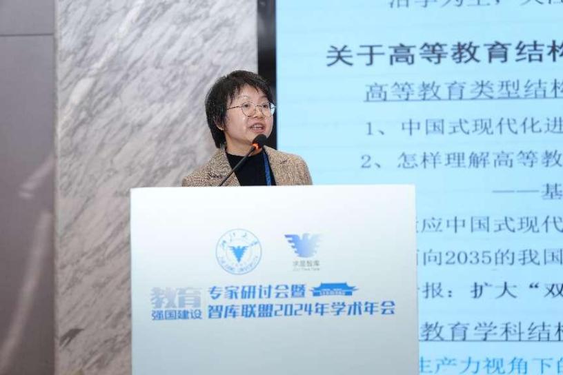 教育部中国人民大学教育发展与公共政策研究中心副主任胡娟教授作题为《优化高等教育结构,建设教育强国》的专家报告,强调了高等教育类型结构与学科结构研究对于推动政策建议的重要意义。通过中美高等教育学科结构比较,提出了我国高等教育结构的三大矛盾:基础科学薄弱的学科格局与自主创新能力提升之间的矛盾,“集中度高、应用导向强”的本科学科布局与拔尖创新人才培养之间的矛盾,不同层次学科结构趋同与国家创新体系整体效能提高之间的矛盾。应对上述问题,她表示需要改变“存量决定增量”的增长模式,适当发挥市场调节机制,注重学科布局层次差异,在学科调整中尊重教育规律和知识发展规律。
