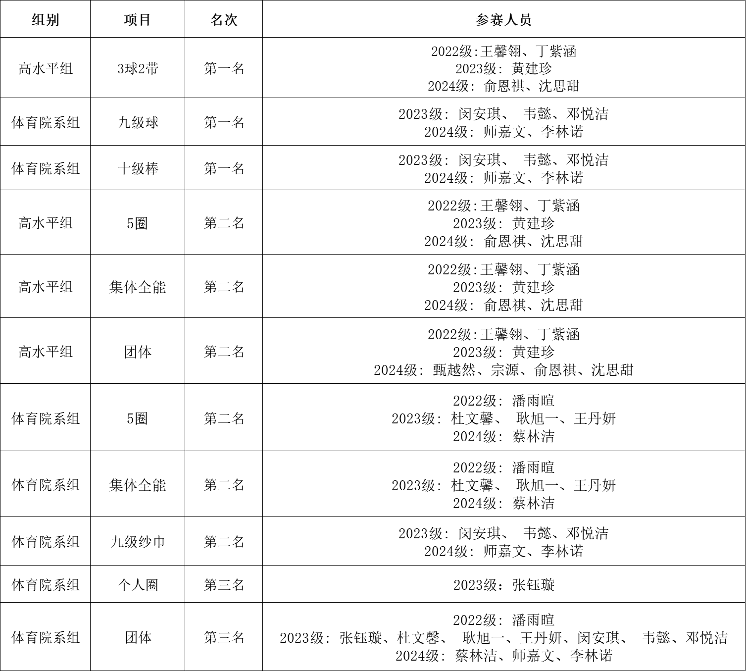 浙江大学艺术体操代表队由yl8cc永利官网体育学系运动训练专业18名同学组成,邱亚君老师担任领队,张玲老师担任主教练,王淇奥同学担任助教,分别参加了高水平组和体育院系组两个组别的个人与集体比赛,最终获得3金6银2铜的优异成绩。