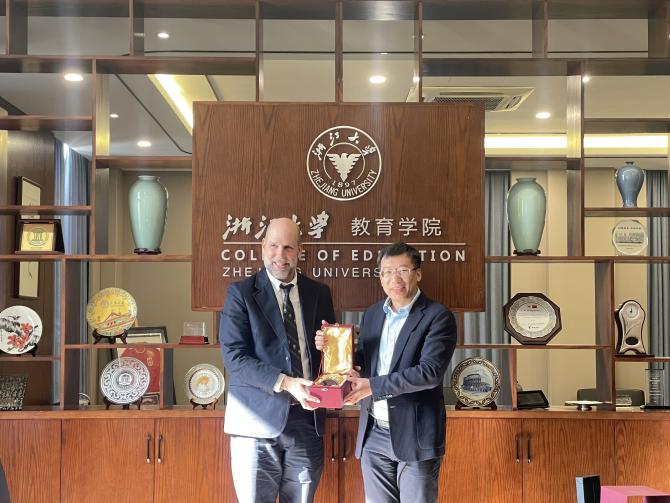 在交流环节,双方简要分享了各自的研究领域与研究成果,并围绕学生联合培养、暑期国际合作项目等多个议题展开探讨与交流。最后,阚阅教授和Joseph Flessa教授进行了礼物互赠。