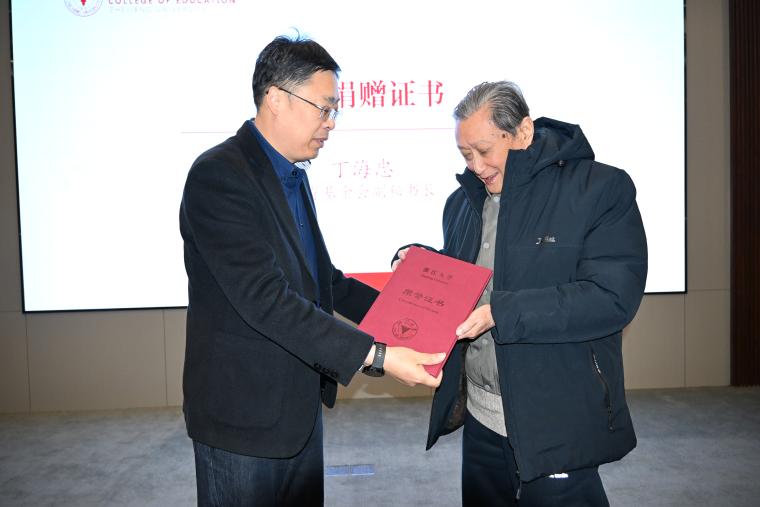 捐赠仪式上,学校发展联络办公室副主任、教育基金会副秘书长丁海忠向叶朝生先生颁发捐赠证书。
