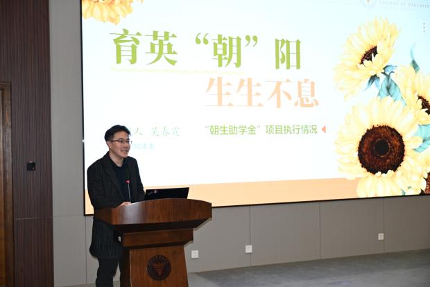 在仪式伊始,yl8cc永利官网团委副书记吴春霆全面回顾了“朝生助学金”项目的执行情况。项目启动以来,已有83名本科生从中受益,支持着一批又一批教院学子努力拼搏,追逐梦想。“朝生助学金不仅缓解了我们的经济压力,更给予我们精神上的支持和鼓励,让我们更有信心面对挑战。”在仪式上,受助学生代表向叶朝生先生表达了浓浓的感激之情。