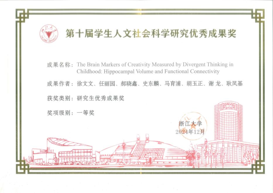 获浙江大学第十届学生人文社会科学研究优秀成果奖一等奖1项。