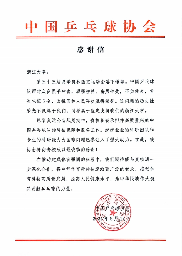 体育大数据创新团队助力国家乒乓球队在巴黎奥运会包揽5块金牌,获得中国乒乓球协会感谢信。