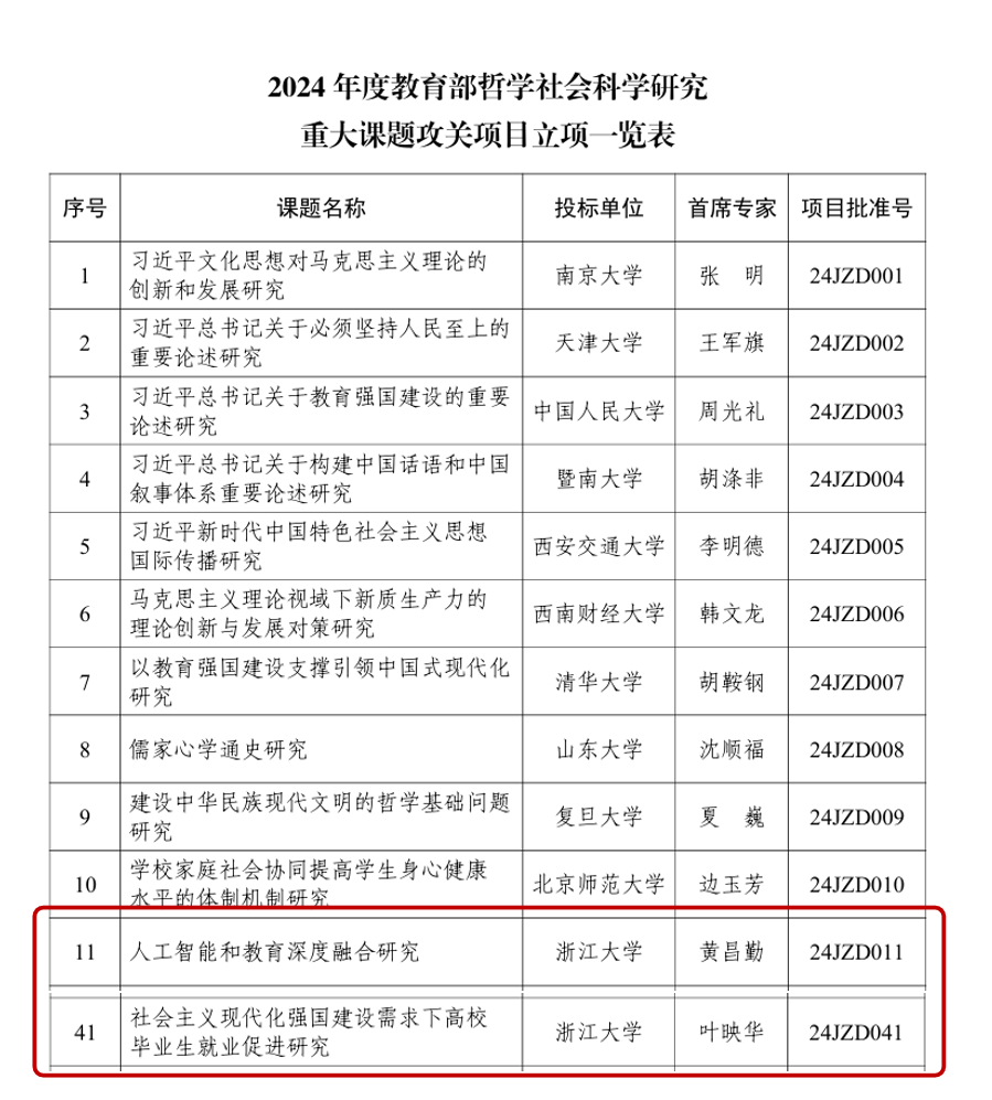 近日,教育部发布2024年度教育部哲学社会科学研究重大课题攻关项目立项名单,本年度,全国共立项43个项目。yl8cc永利官网黄昌勤教授领衔的“人工智能和教育深度融合研究”,叶映华教授领衔的“社会主义现代化强国建设需求下高校毕业生就业促进研究”获批立项,取得新突破。
