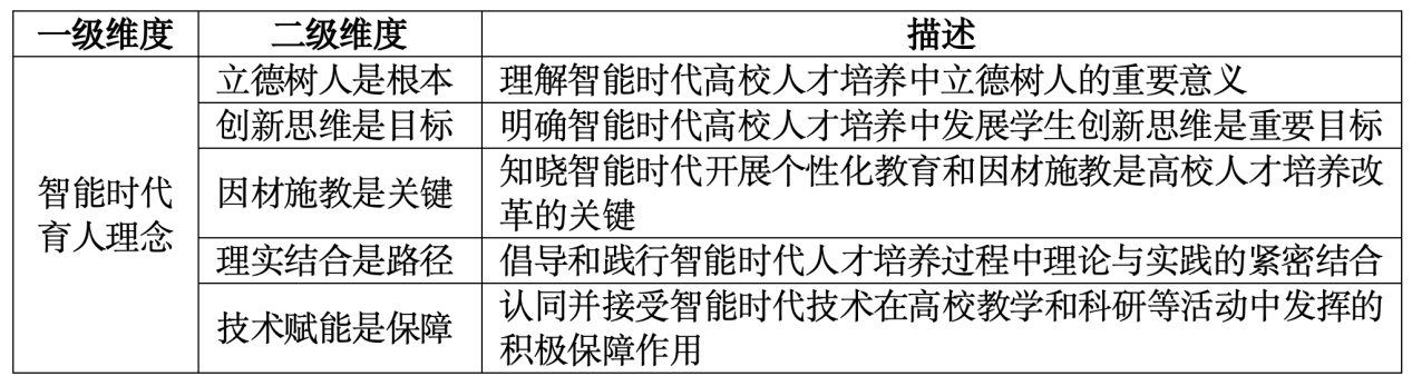 一是智能时代育人理念。智能时代育人理念指高校教师能够深刻理解培养德智体美劳全面发展的社会主义建设者和接班人是中国高校人才培养的根本任务;明确创新思维是智能时代全球公认的人才核心竞争力所在,因此,发展大学生创新思维是高校育人重要目标;知晓智能技术赋能的因材施教是高校人才培养改革的关键;倡导理实结合并理解其对于高校创新人才培养和知识发现的重要性;认同并接受智能技术在高校教学和科研等活动中的独特优势及积极保障作用。