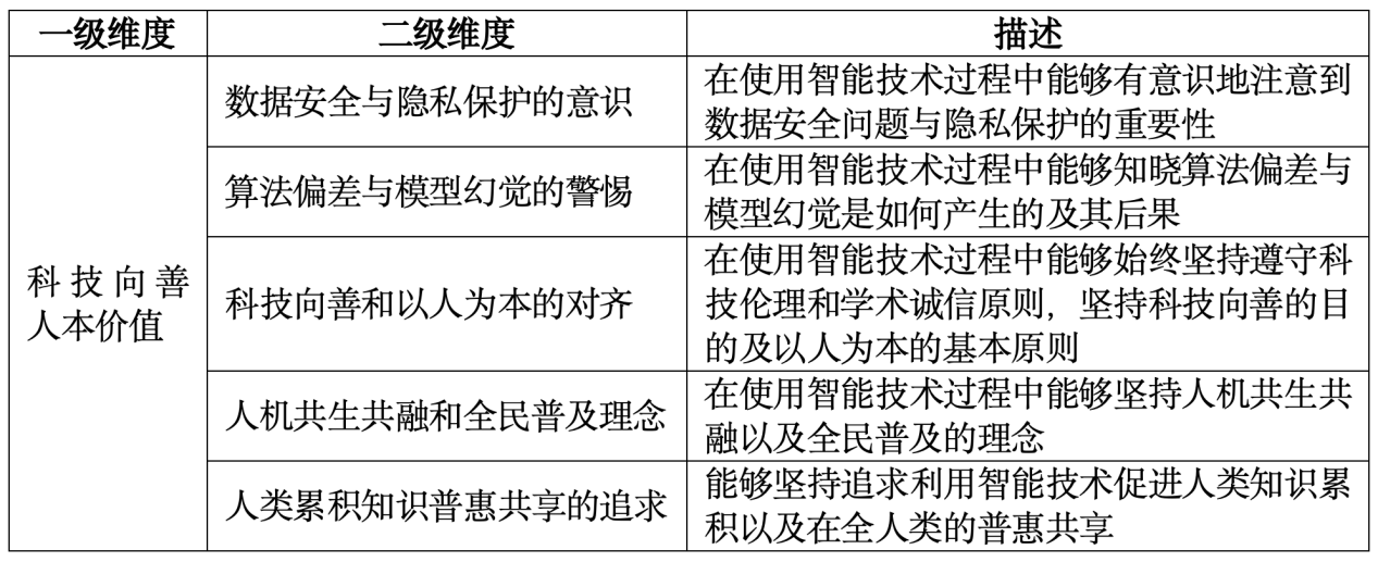 五是科技向善人本价值。科技向善人本价值指高校教师能够主动理性审视智能技术可能带来的优缺点,坚守科技进步为人类福祉提升服务的宗旨。在人机协同过程中关注师生个人隐私数据以及科研隐私数据的安全性;了解并深刻理解算法模型特性及负面影响,在使用时保持底线思维和风险意识;始终坚持并引导学生遵守科技伦理原则,建立科技向善和以人为本的基本原则与价值观;确保科技成果造福于民,实现人工智能全民普及理念;积极思考如何利用智能技术促进专业领域知识的累积,将推进全人类普惠共享学科前沿知识作为追求。