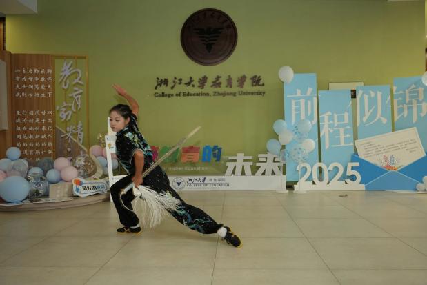 本次晚会还设置了精彩的外场环节,由潘昕语同学主持。学院2024级艺术体操队带来的表演《九州同》,通过柔美与力量并存,舞动出教院人的风采;金芸曲和金芸全同学带来了飒爽的武术表演《武缘》,以飒爽英姿和刚劲有力的招式,展现了教院人昂扬向上的风采。